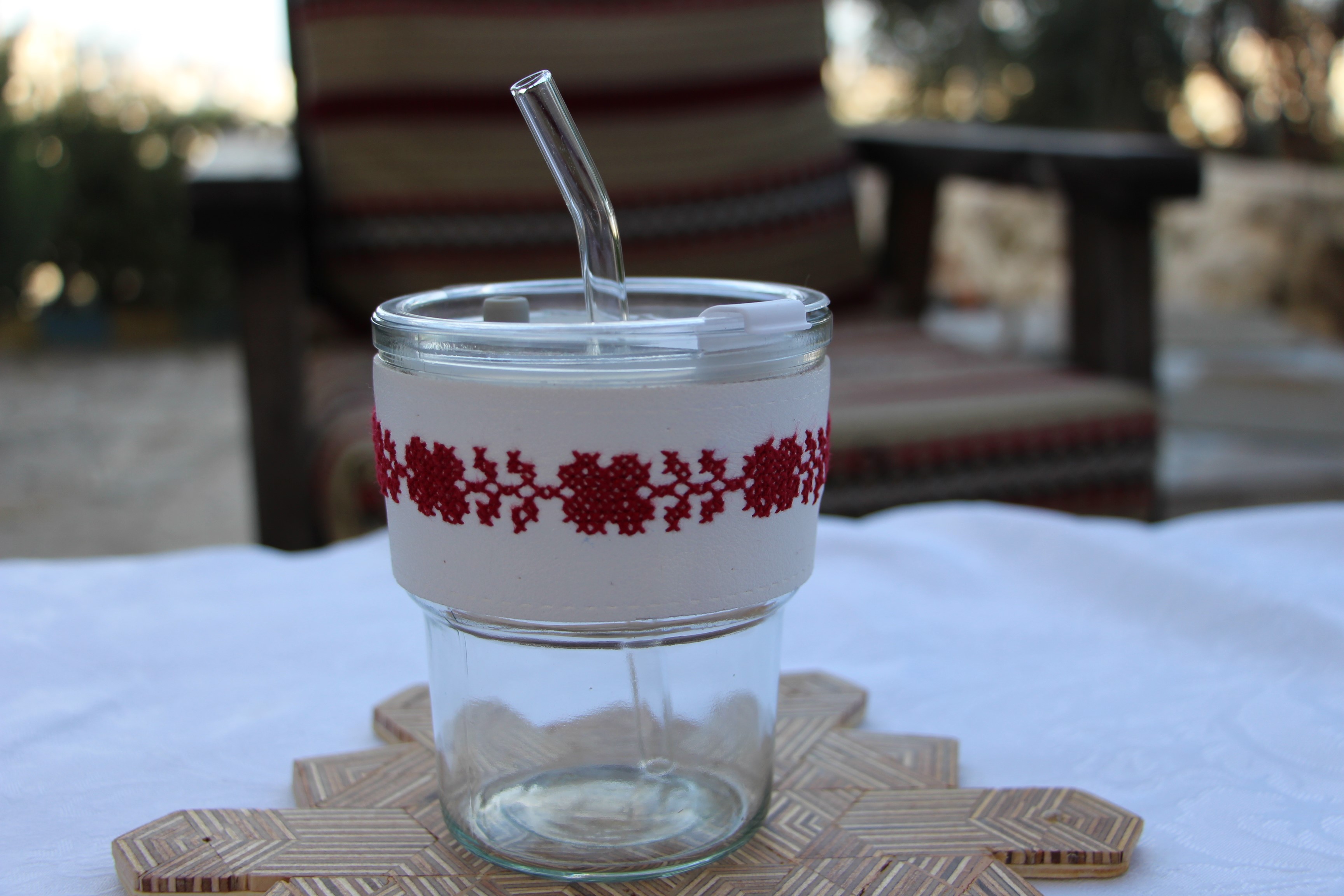 Enjoy a unique experience with this glass coffee mug featuring a hand-embroidered leather holder, inspired by authentic Palestinian craftsmanship. The embroidered holder adds vibrant colors and artistic charm while making the mug practical and comfortable to use.