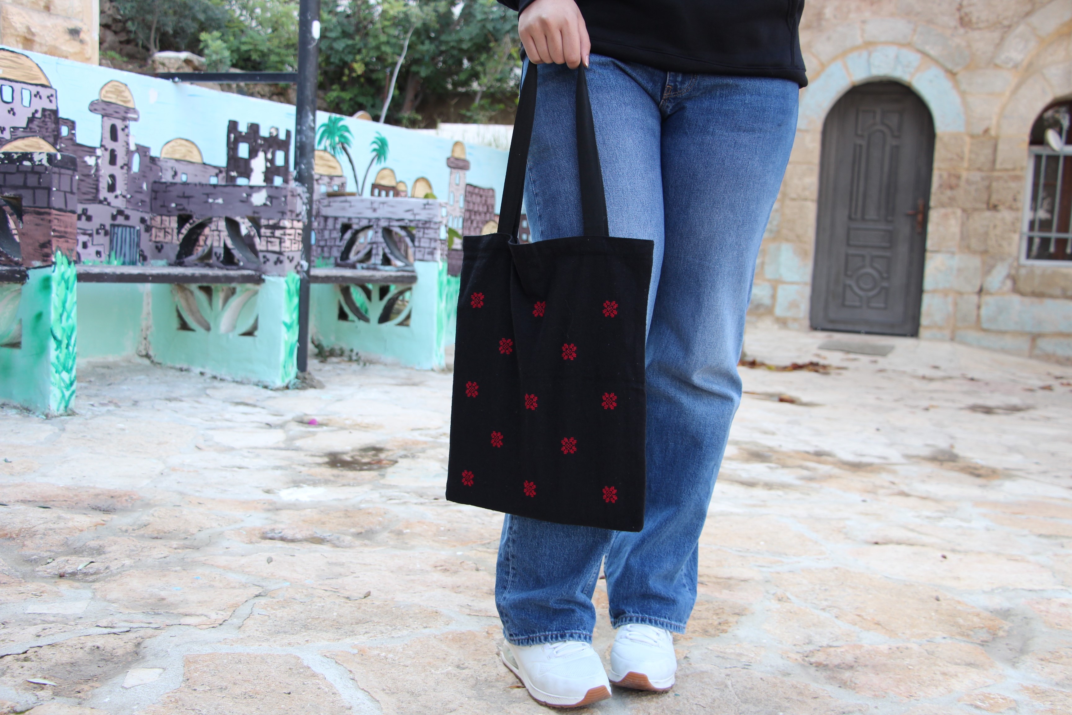 - Hand-embroidered with authentic Palestinian colors