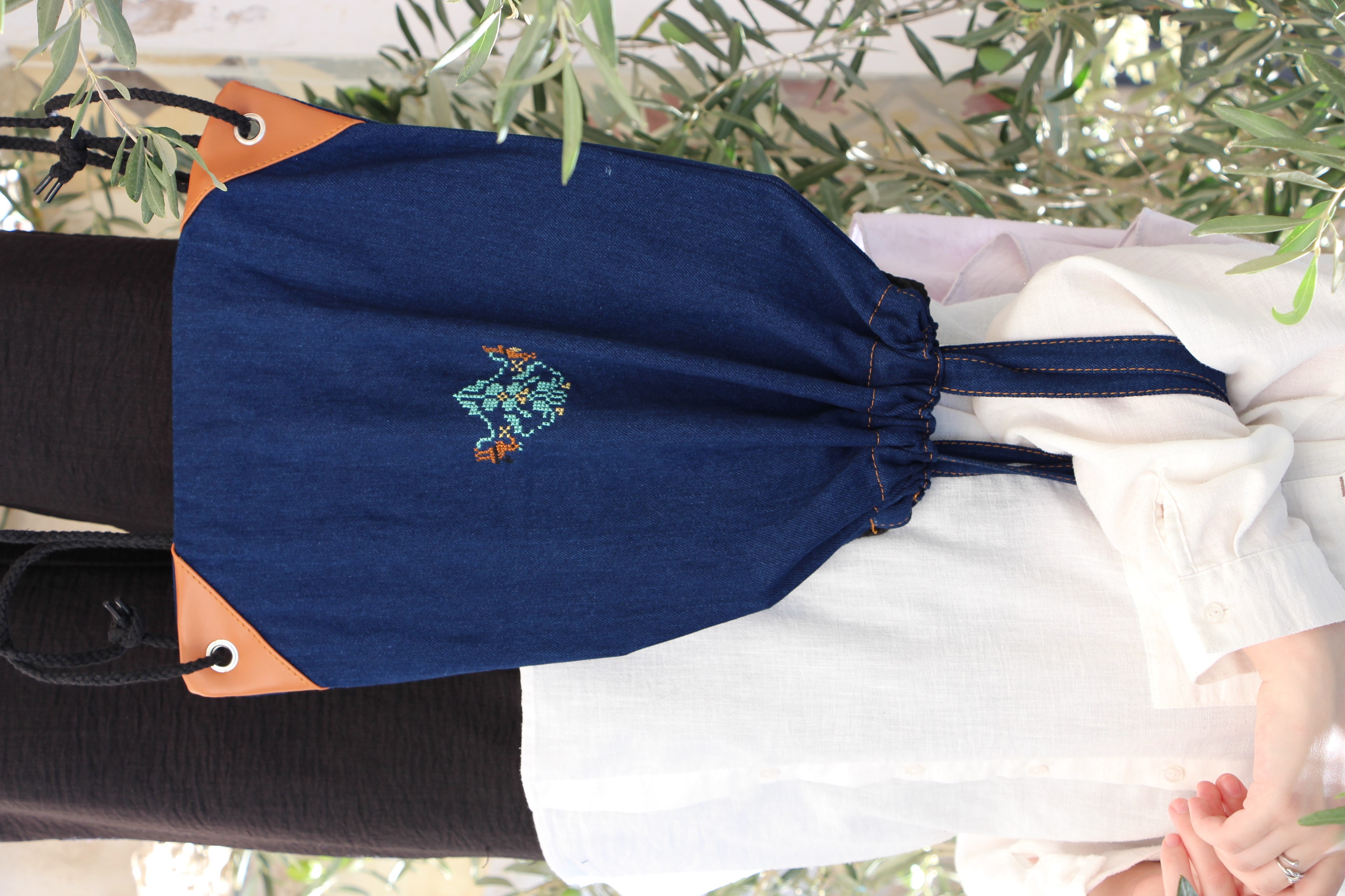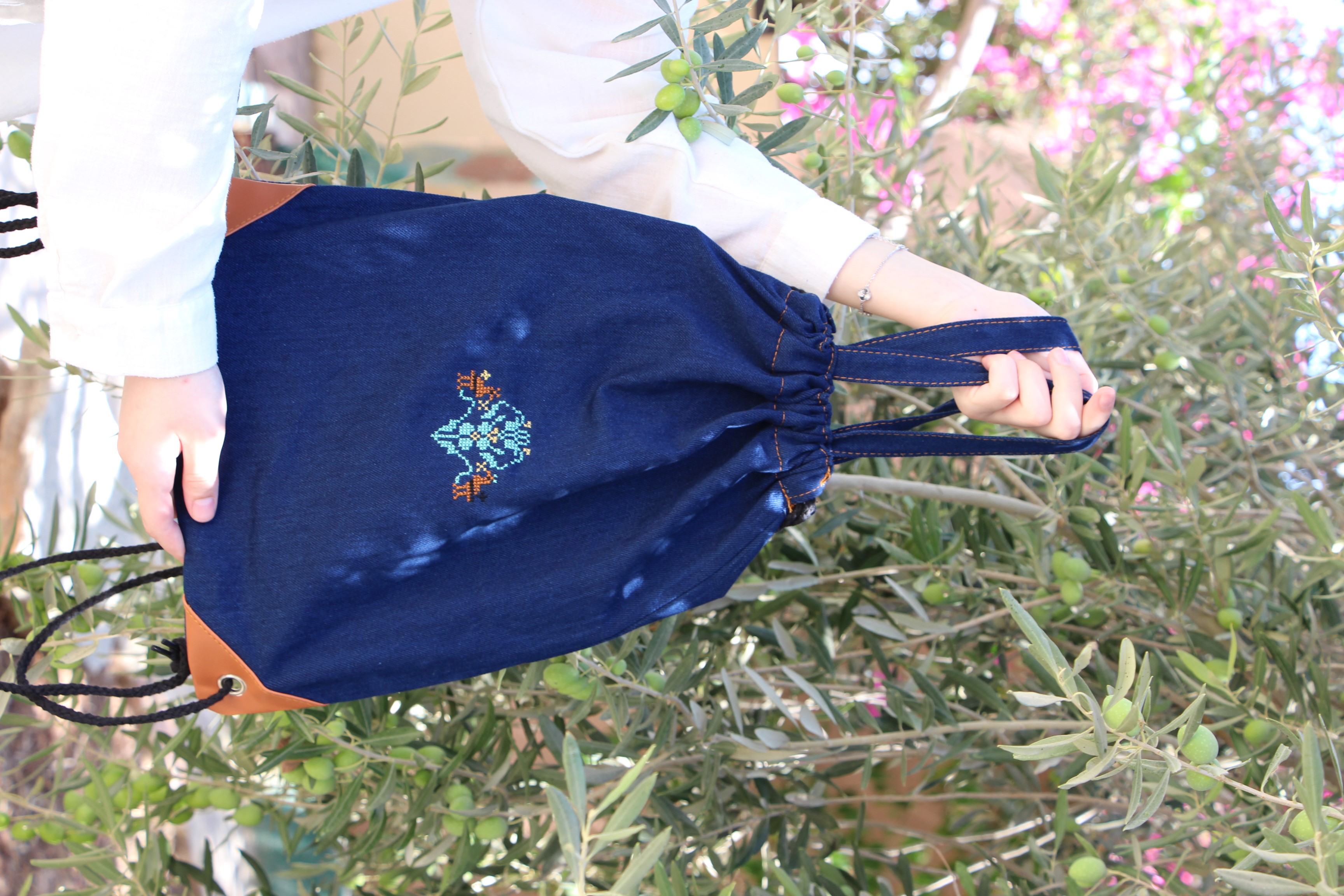 This denim bag is designed from durable fabric to accompany you in everyday use, featuring light handmade embroidery that adds an elegant artistic character. Its multi-purpose design allows it to be used as a daily bag, a light work bag, or a university bag.