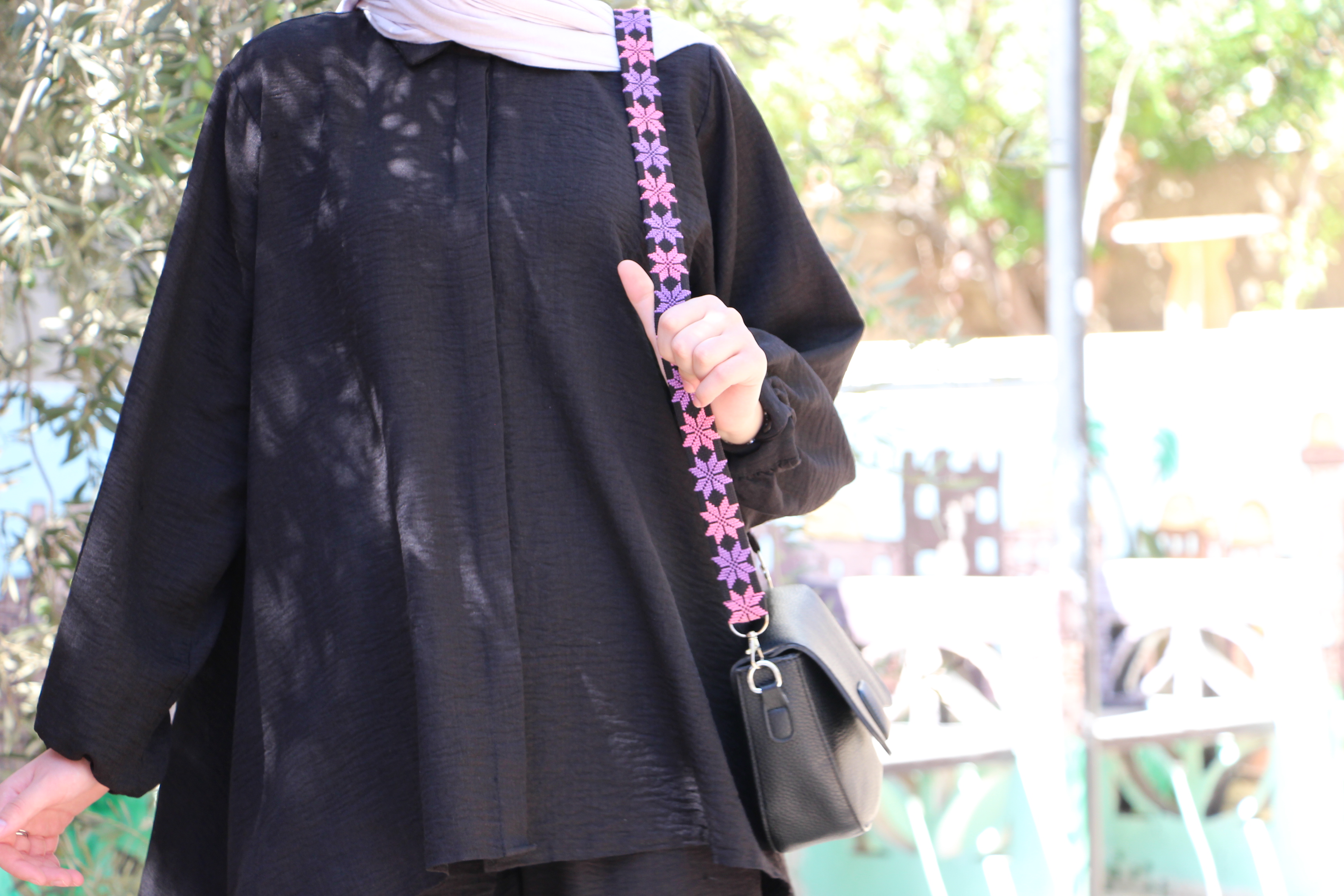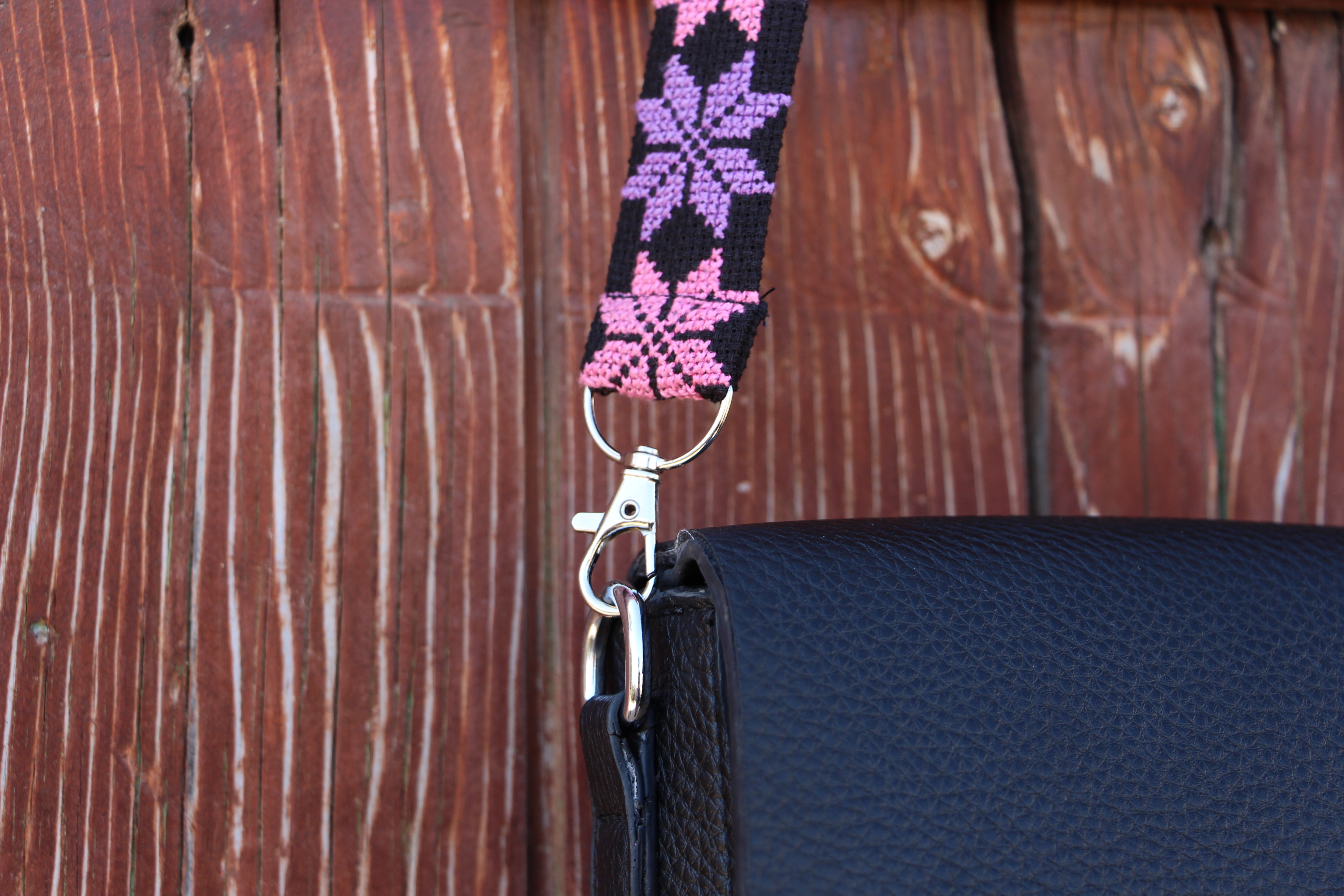 An elegant bag strap featuring a star pattern inspired by Palestinian embroidery, designed in a vibrant mix of pink and purple. A lively and modern design that keeps the essence of cultural heritage.