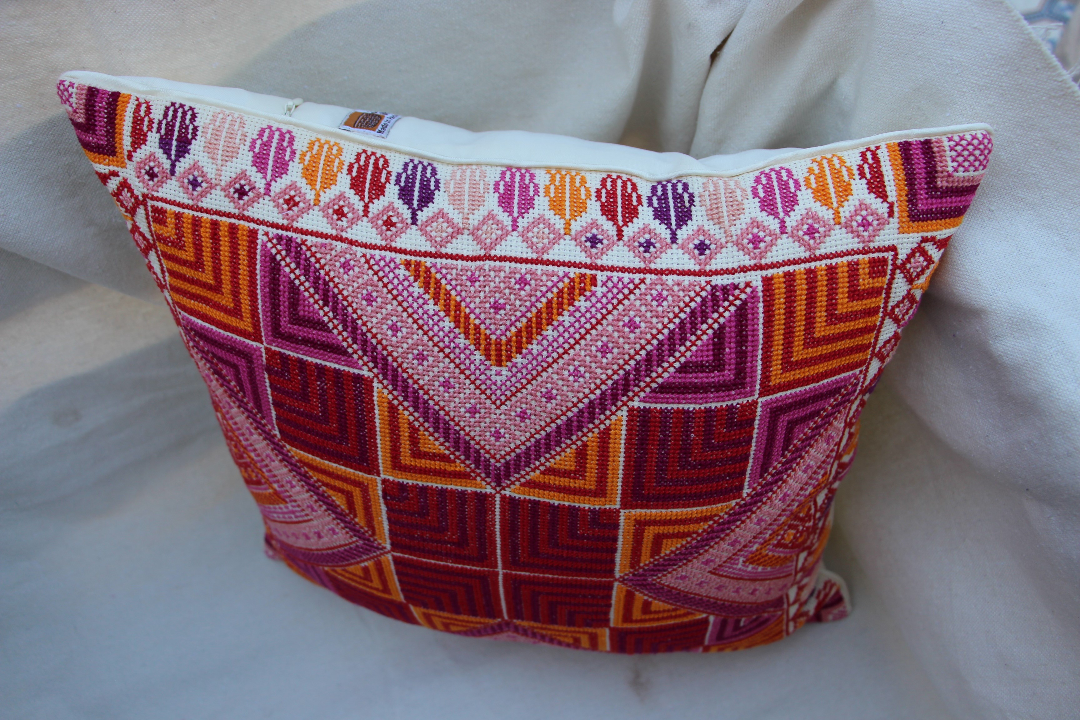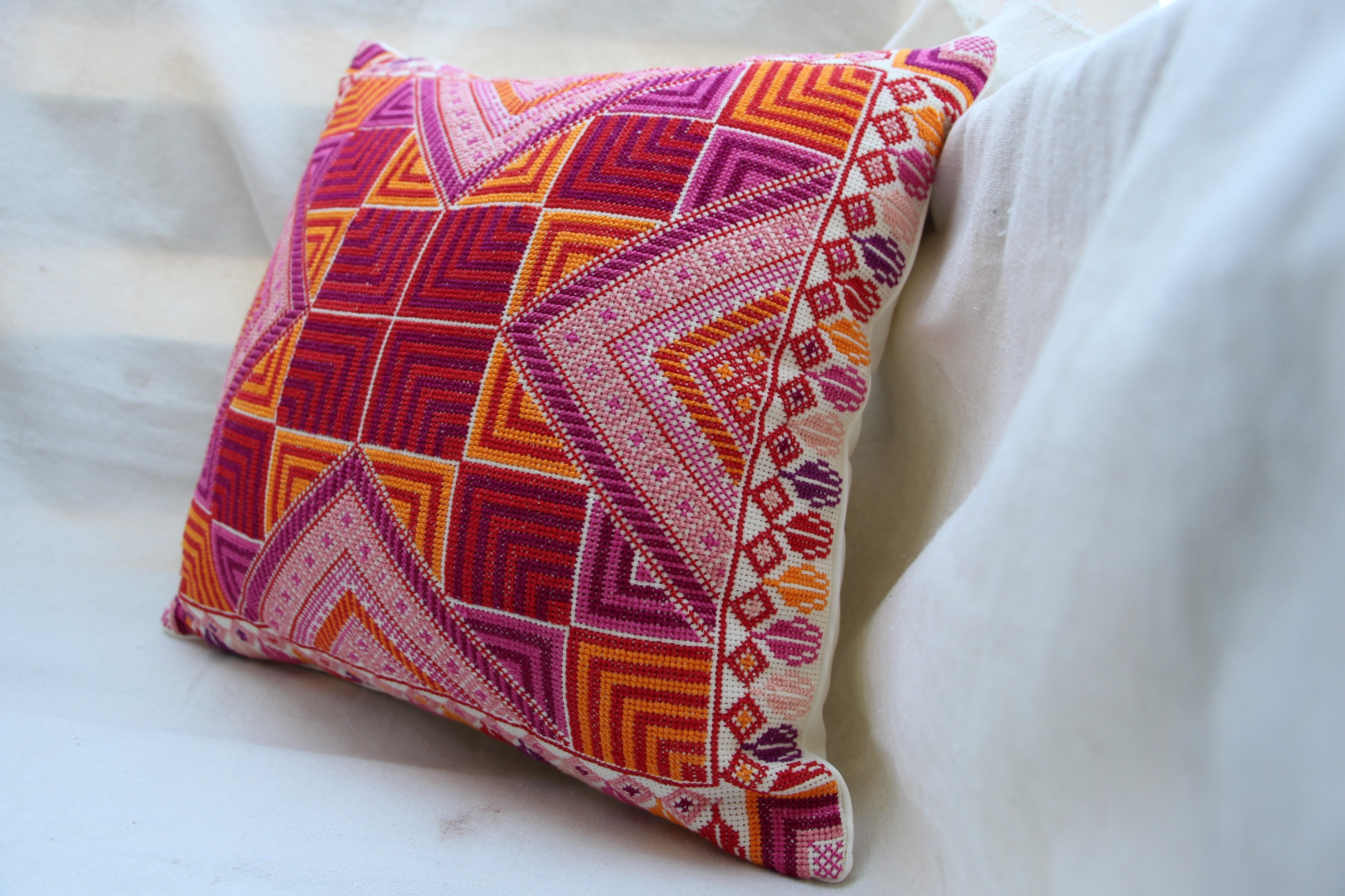 This pillow cover is meticulously hand-embroidered to reflect the spirit of Palestinian heritage and the beauty of the Feather Motif (Nafnouf). Sunset-inspired colors give the pillow a warm and lively character, creating visual harmony in any space.