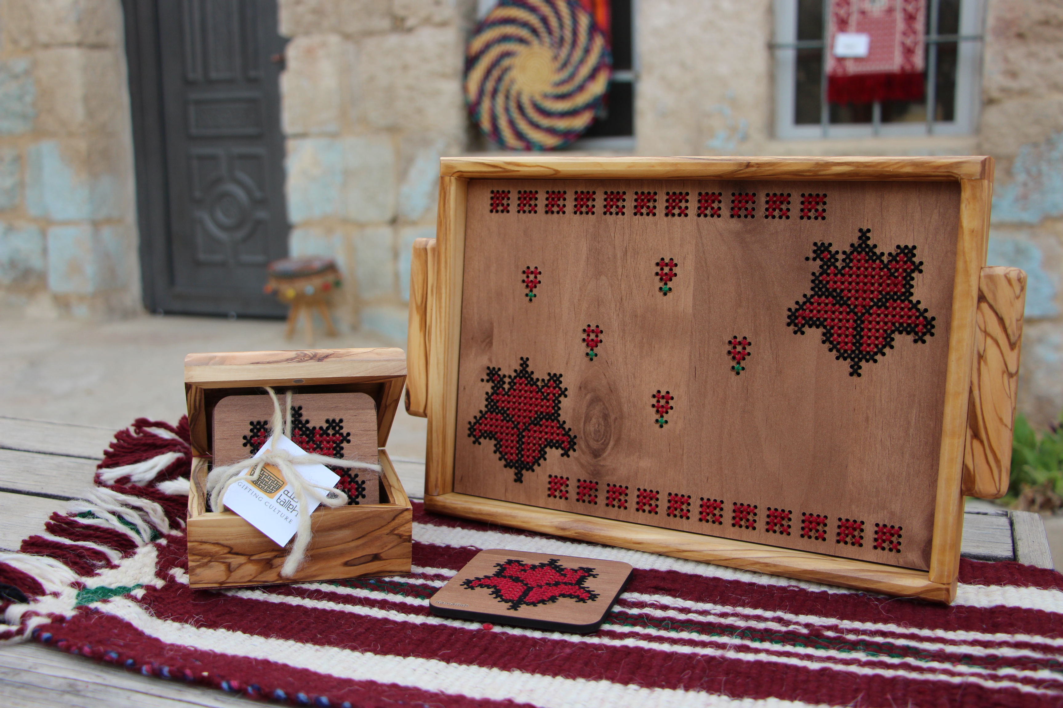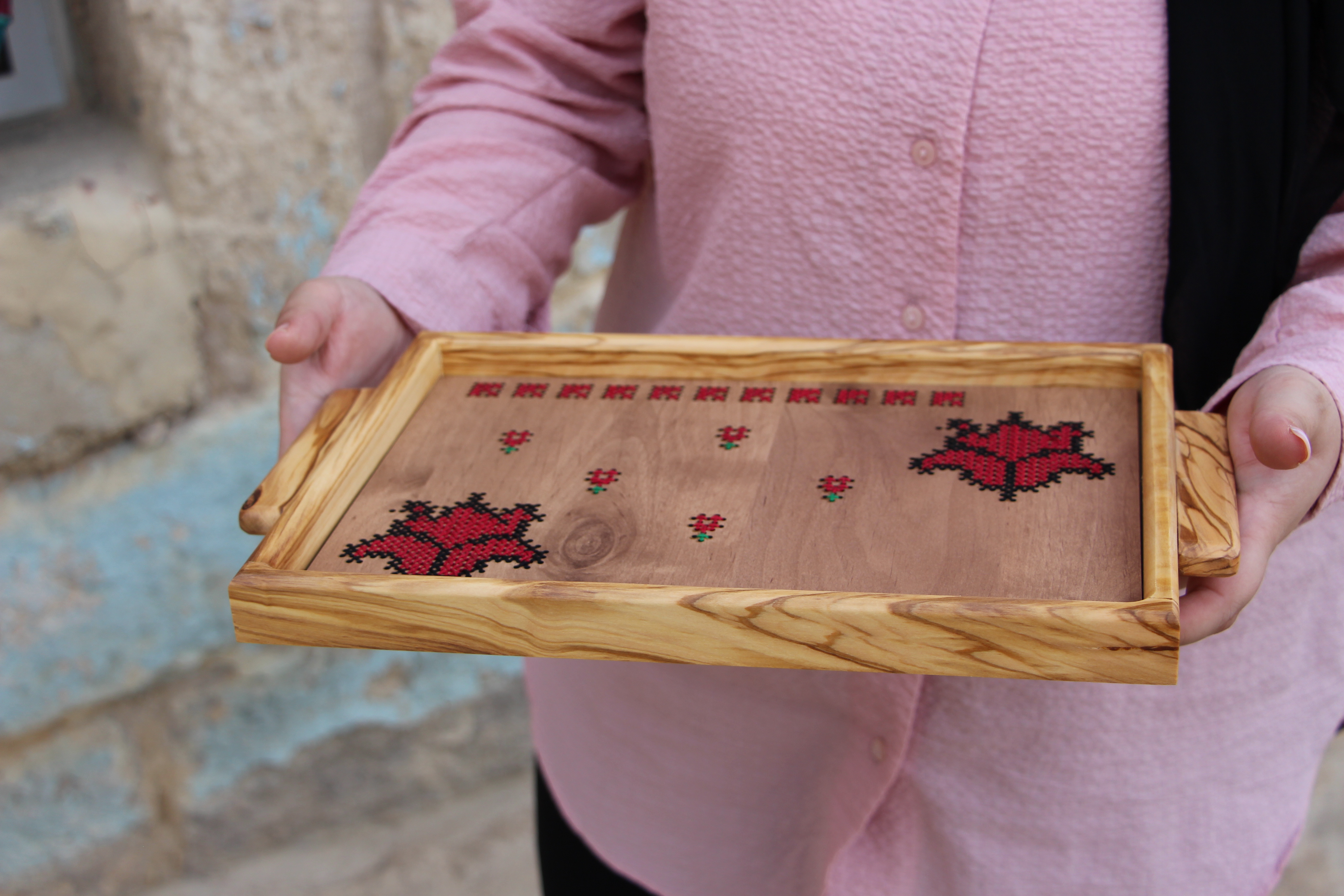 This elegant olive wood tray features a hand-embroidered design of the city of Ramallah, crafted meticulously by the skilled hands of Talha artisans. Perfect for serving and entertaining, it combines functional beauty with a deep connection to Palestinian heritage. Each tray reflects the care and craftsmanship that make Palestinian handcrafts unique.