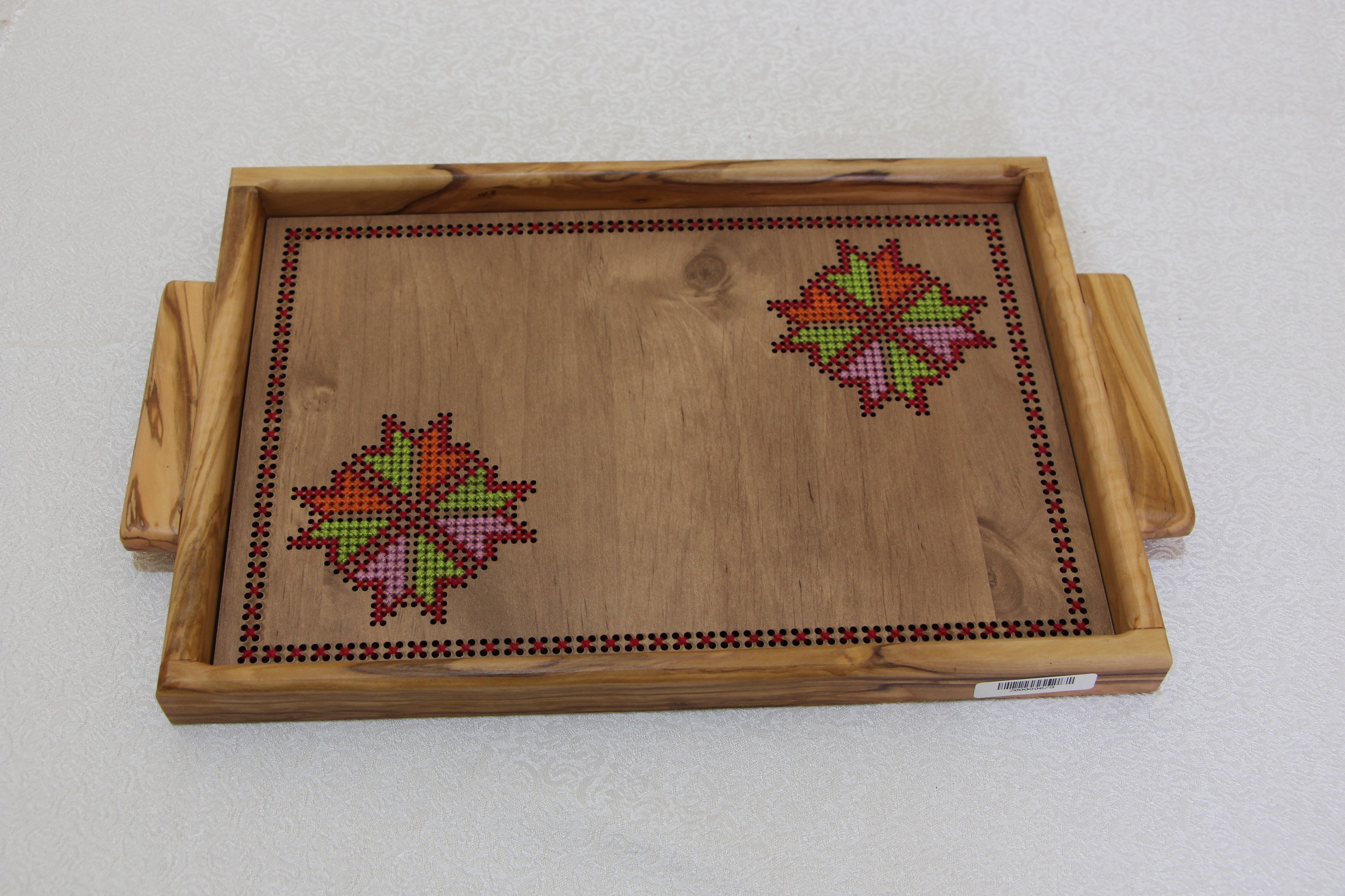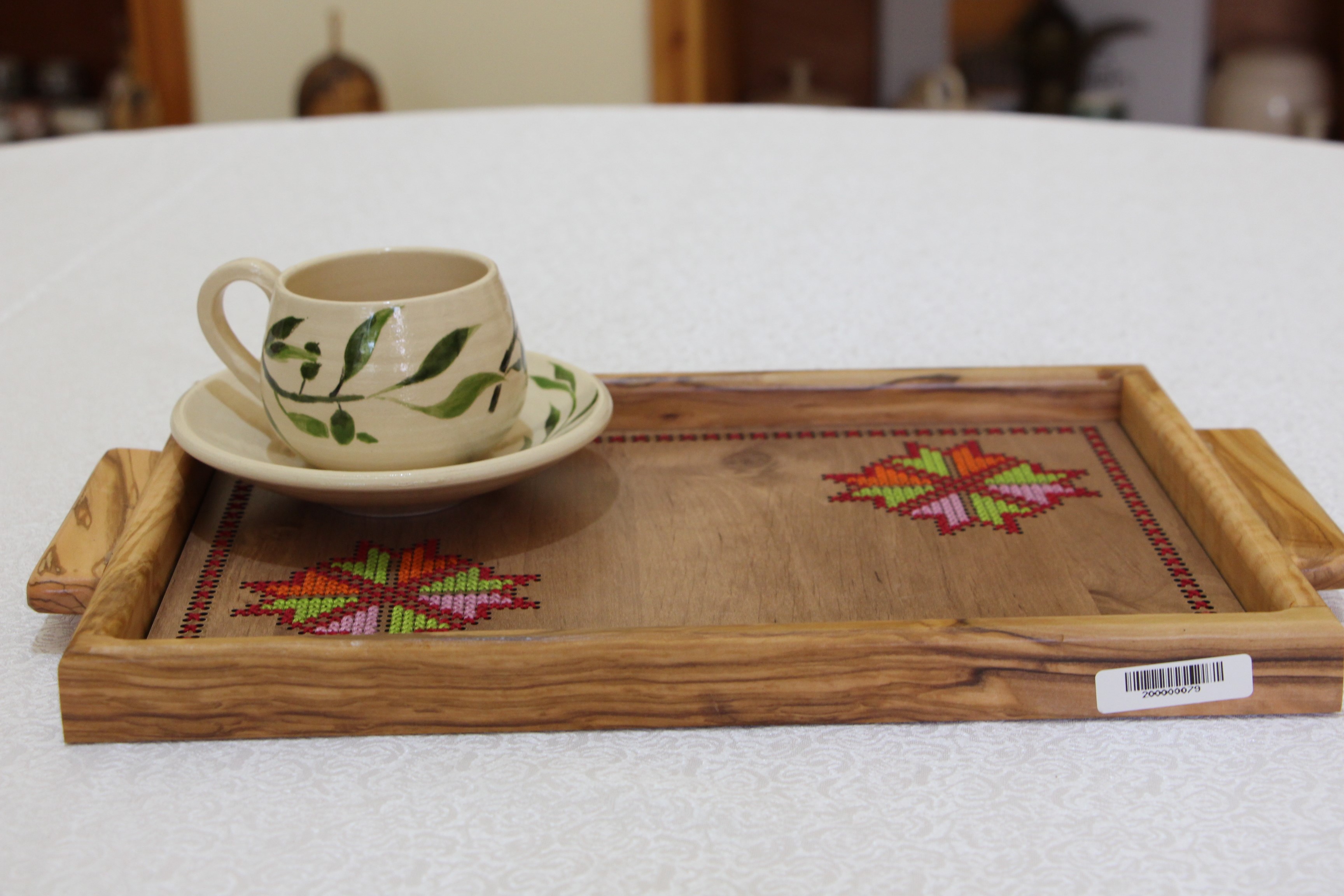 This elegant tray is crafted from natural olive wood and features hand embroidery inspired by the city of Jerusalem, stitched with natural silk threads. Carefully handmade by skilled artisans, the tray reflects the spirit and rich history of Jerusalem in a functional yet artistic piece.
