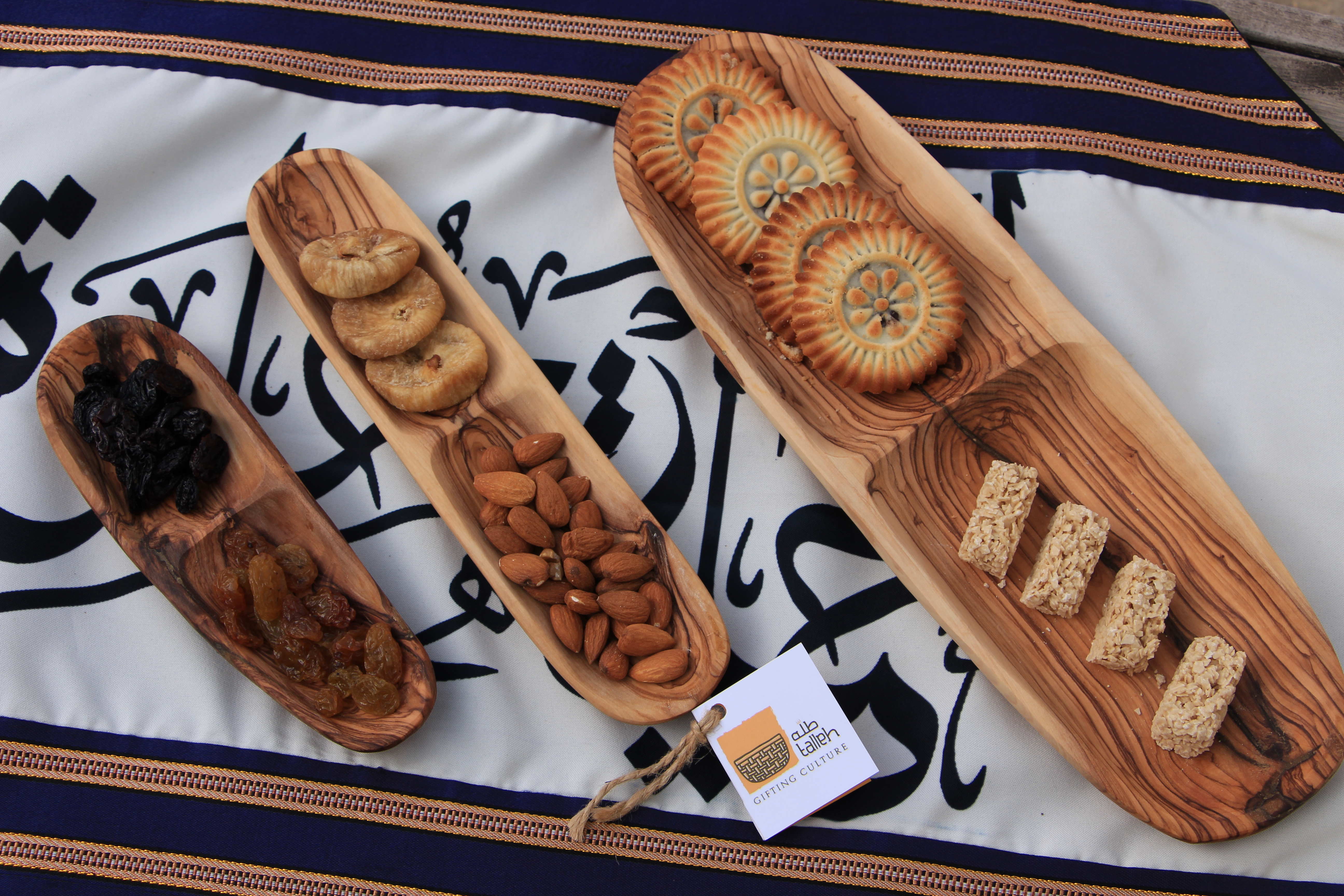 This set reflects the beauty of Palestinian craftsmanship through a practical and elegant design. Each plate is carved from a single piece of natural olive wood and divided into two sections for easy and organized serving. The variety of sizes makes the set suitable for everyday use as well as special occasions.
