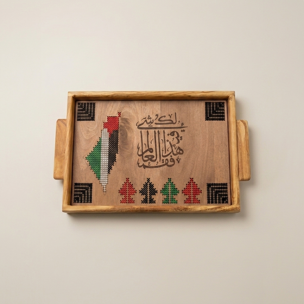This tray is crafted with care, combining the beauty of olive wood with detailed hand embroidery. The Palestinian flag c..